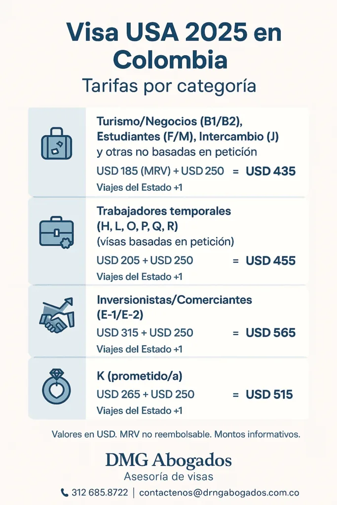 En DMG Abogados te acompañamos en todo el proceso: elección de categoría, diligenciamiento correcto del DS-160, validación de tarifas, agendamiento y preparación para la entrevista. Escríbenos y te guiamos paso a paso hasta la entrega del pasaporte.